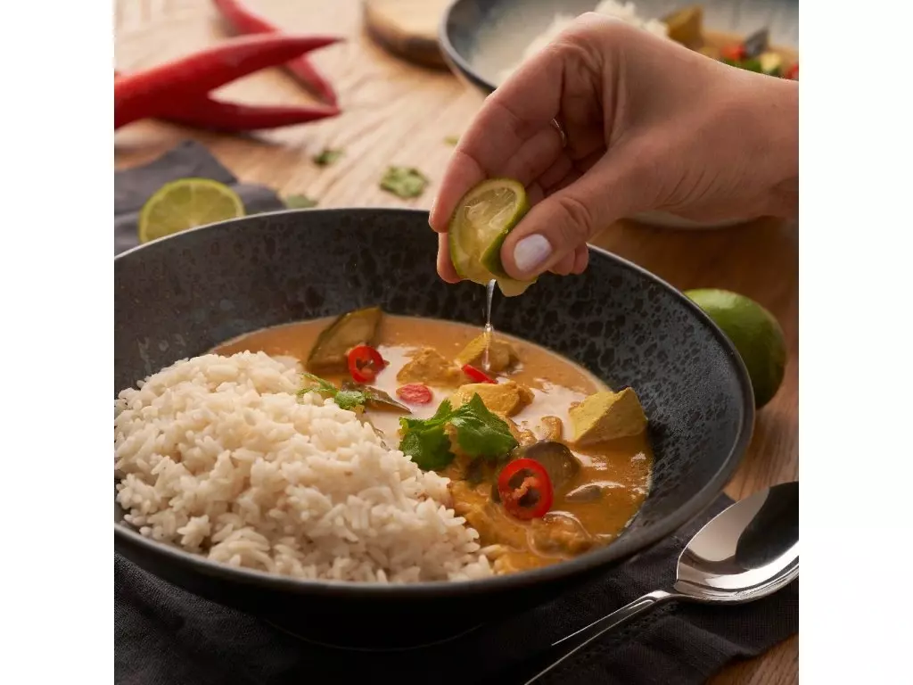 Tradiční thajské jídlo podle originální receptury. Jemná a přitom trochu pálivá omáčka z kokosového mléka s nejlepším tofu a šťavnatým lilkem.