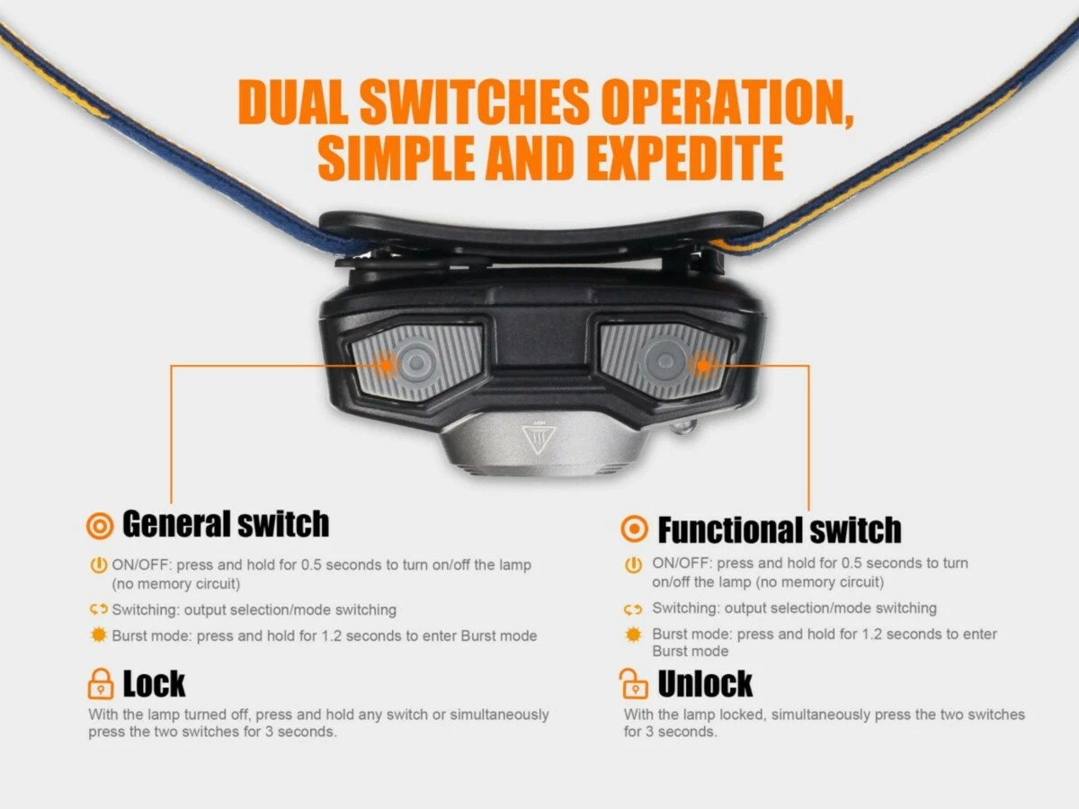 Burst režim (600 lumenů) se aktivuje podržením libovolného tlačítka po dobu 1,2 sekundy (i pokud je čelovka vypnutá). Dalším stisknutím pravého tlačítka se čelovka vrátí do původního režimu.