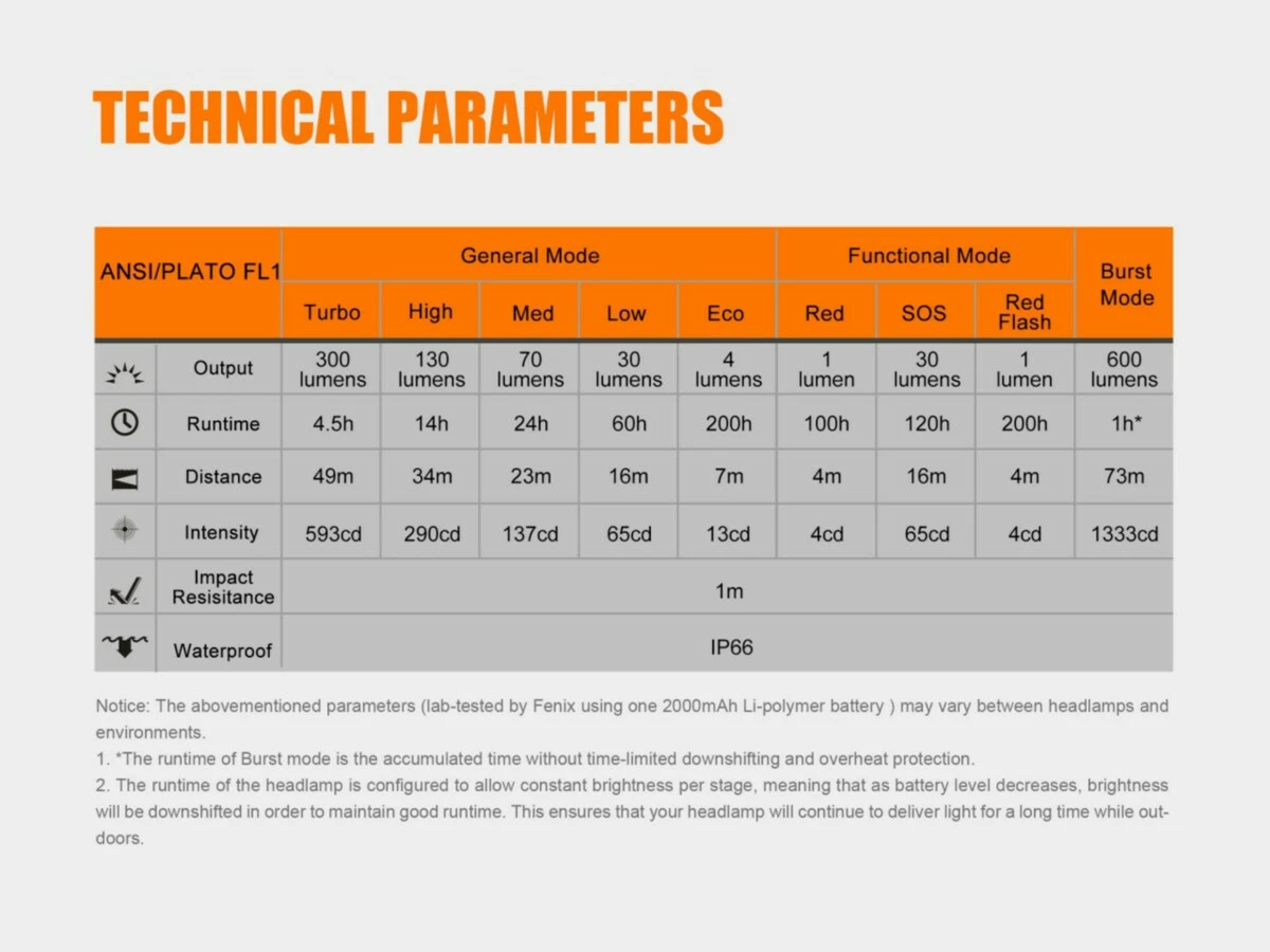 Všechny parametry čelovky (světelný tok, doba provozu na baterie, vodotěsnost, dosvit a nárazuvzdornost) jsou změřeny v souladu s normou ANSI/NEMA FL 1-2009.