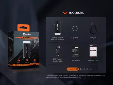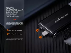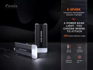 Kombinuje v sobě funkci svítilny a powebanky pro dobití USB-C telefonu k nouzovému použití. Napájení zajišťuje vestavěný Li-pol akumulátor o kapacitě 800 mAh, který se dobíjí prostřednictvím moderního USB-C konektoru. Kromě bílého světla s dosahem až 30 metrů nabízí svítilna i stálé červené světlo a červené blikání, které můžete použít pro signalizaci v nouzi nebo zvýšení své viditelnosti v silničním provozu. Díky plochému tvaru a malé velikosti můžete mít Fenix E-SPARK stále u sebe na klíčích, v kapse či kabelce.