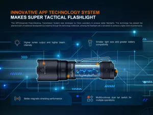 - Se svítilnou je kompatibilní i následující příslušenství: rychloupínací montáž na lištu ALG-15, rychloupínací montáž na lištu ALG-00, montáž na M-LOK Fenix ALG-16, montáž na hlaveň Fenix ALG-18, kovová magnetická montáž na hlaveň, plastová magnetická montáž na hlaveň, montáž svítilny na optiku, kovová montáž na optiku, popruh Fenix ALD-05 pro použití svítilny na přilbě, držák na kolo FB-1, držák na kolo Fenix.