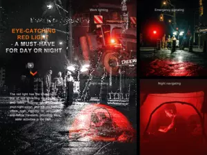 Podržením oranžového tlačítka při vypnuté svítilně ji zapnete do režimu červeného světla. Krátkými stisky oranžového tlačítka přepínáte mezi stálým červeným světlem a blikačkou.