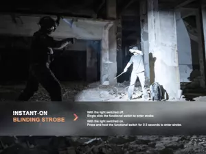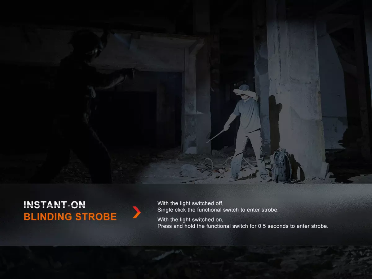 Pro zapnutí/vypnutí zmáčknete větší taktické tlačítko umístěné na konci svítilny, pro okamžitou aktivaci tlačítko namáčkněte. Stiskem vedlejšího přepínacího tlačítka můžete kdykoliv během provozu přepínat mezi režimy výkonu. Pro přepnutí do zábleskového režimu při zapnuté svítilně přidržte přepínací tlačítko zhruba 0,5 vteřiny. Pro zapnutí svítilny přímo do stroboskopického režimu stiskněte a držte přepínací tlačítko.