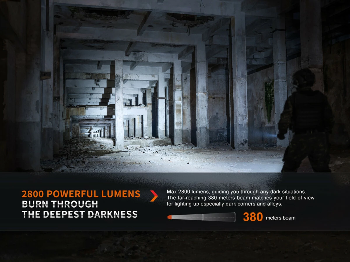 Nabíjecí taktická svítilna Fenix PD36R PRO nabízí špičkový světelný tok až 2800 lumenů (ANSI) a dosvit až 380 metrů.
