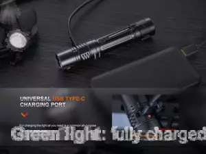 Nabíjení - odklopte gumovou krytku nabíjecího konektoru na boku svítilny a zapojte přiložený kabel (konektor USB-C), druhý konec kabelu zapojte do počítače, nebo USB adaptéru do elektrické sítě či auta. Během nabíjení svítí boční indikátor červeně. Po plném nabití se rozsvítí zeleně. Nabíjení plně vybitého akumulátoru trvá cca 4 hodiny. Během nabíjení nelze svítilnu používat.
