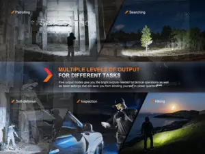 - Šest režimů výkonu: 2800 lumenů (3,5 hodiny) -> 1000 lumenů (3,9 hodin) -> 350 lumenů (8,25 hodin) -> 150 lumenů (19 hodin) -> 30 lumenů (42 hodin) -> strobe (stroboskopické blikání s proměnlivou frekvencí).