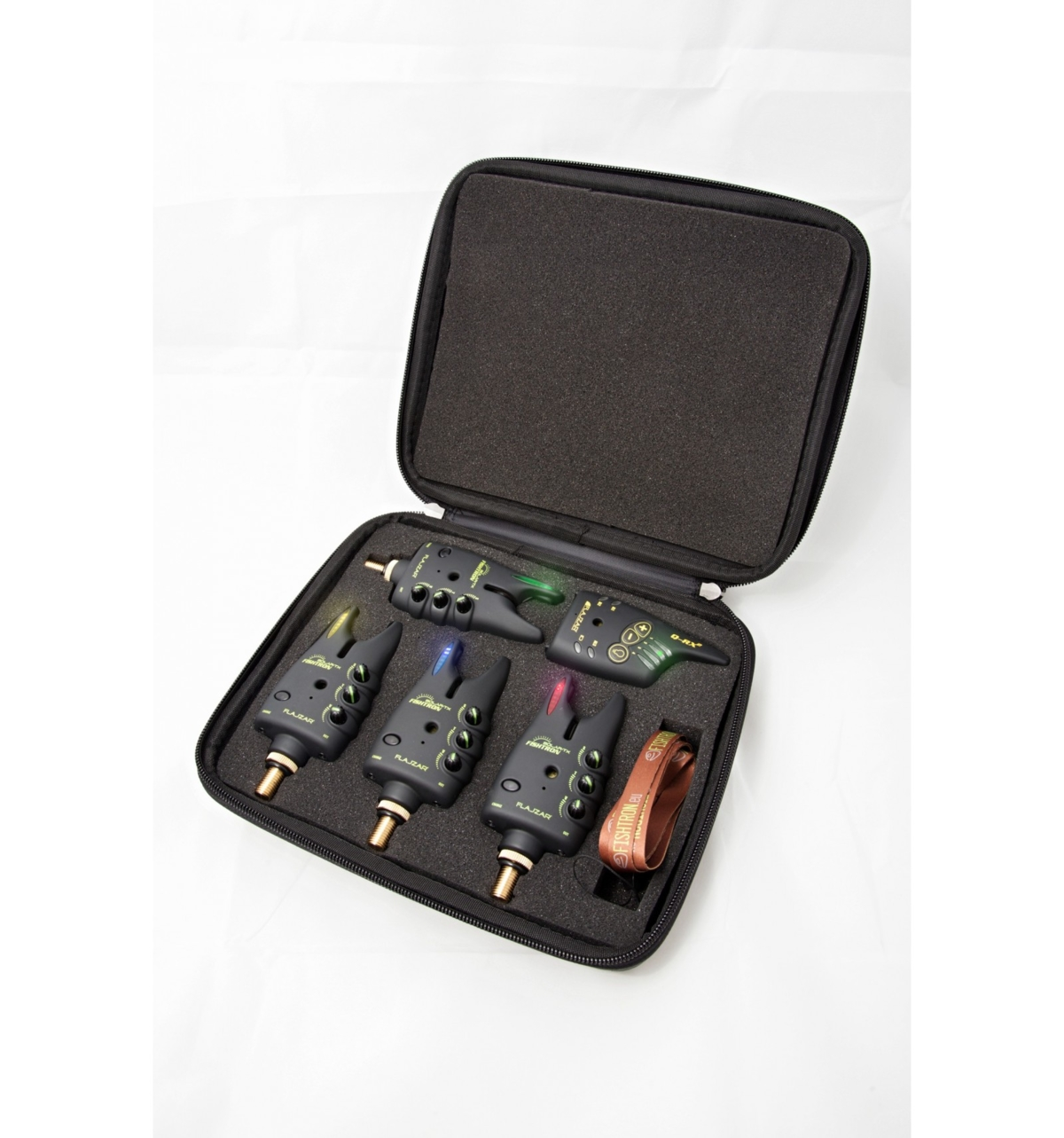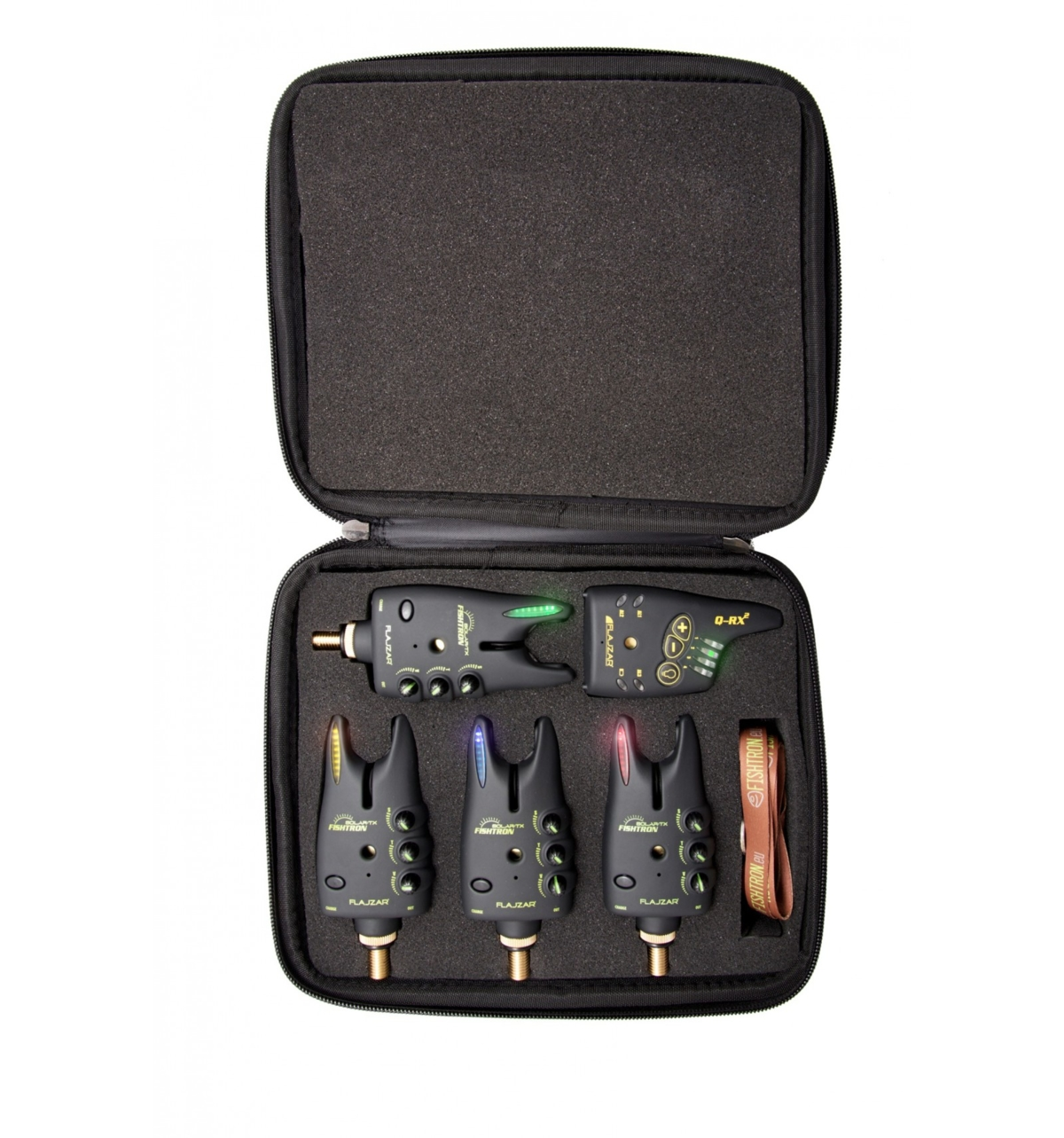 Sada solárních hlásičů FLAJZAR FISHTRON Q-SOLAR-TXB, Q-SOLAR-TXG, Q-SOLAR-TY, Q-SOLAR-TXR s příposlechem Q-RX2 a kufříkem.