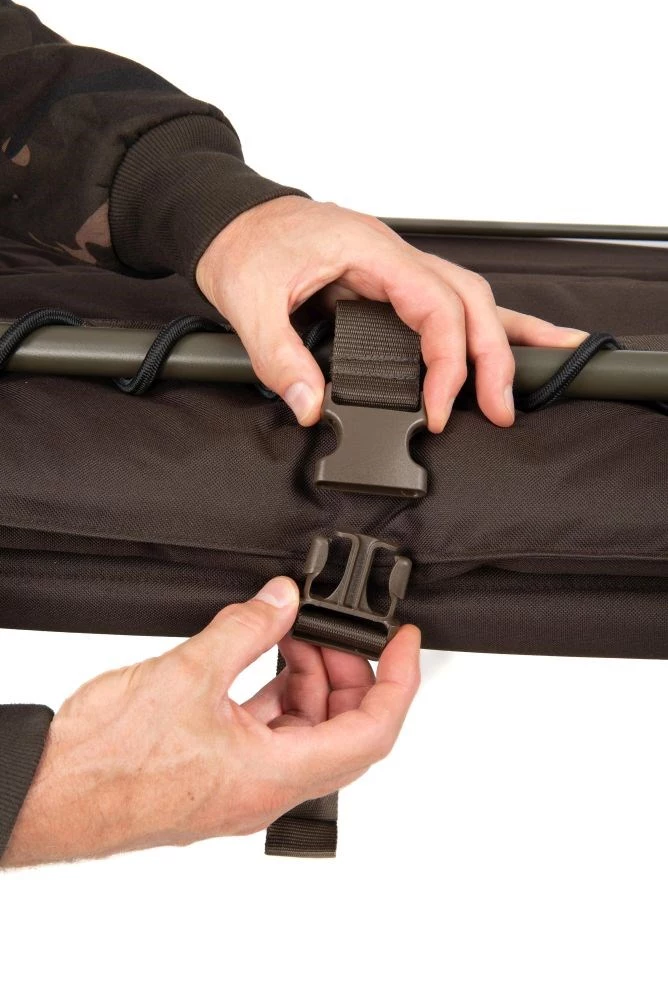 Praktický systém popruhů a přezek umožňuje lehátko kompaktně složit, a to i se spacím pytlem připevněným k lehátku.