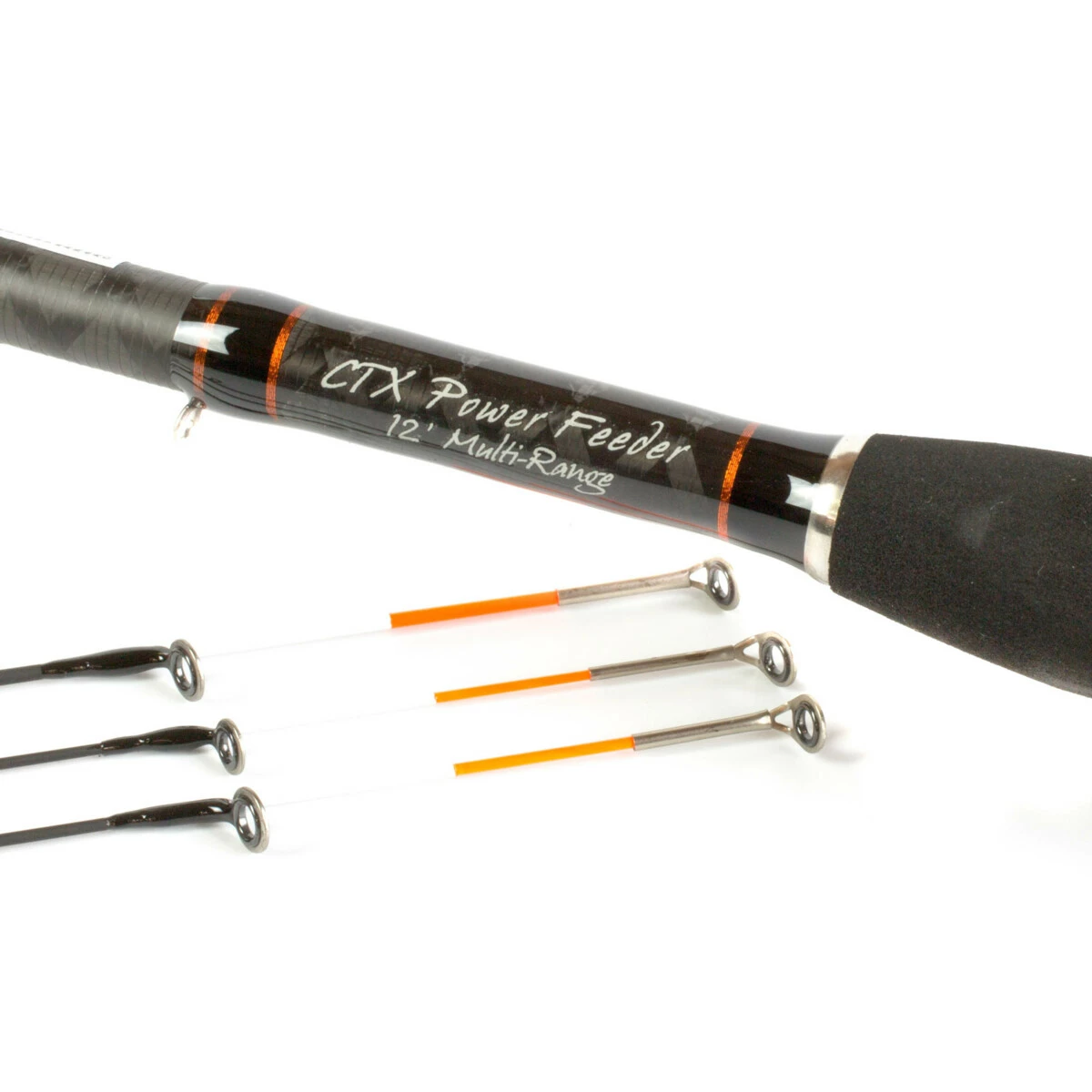 CTX Power feedery jsou stavěné především na větší jezera a řeky, nebo na daleké nahazování s velkými zátěžemi. Zachovávají si přitom skvělé vlastnosti jemnějších feederů, zdolávání si tak krásně užijete. Jsou postavené na blankách CTX s většími očky (včetně těch na chvějivé špičce), díky čemuž můžete použít i šokáč, či šňůru. Mají navíc i prodlouženou rukojeť pro extra dlouhé hody. V nabídce naleznete 2- a 3-dílné modely, přičemž dvoudílné se dělají v délkách 11‘, 12’ a 13’, trojdílné pak v délkách 12‘, 13’ a 14’. Pruty s označením Special jsou více univerzální a poradí si velmi dobře s různými podmínkami lovu. Lehce silnější modely Distance jsou pak ty pravé speciály pro potřeby dalekých hodů. Třídílný CTX Multi Power feeder je univerzální třídílný feeder se zátěží 30 až 60g. Samozřejmostí je bezlaková úprava prutů, 3 různé chvějivé špičky a nejkvalitnější komponenty. Rukojeť je korková, očka KIgan Anti-frap, sedlo Fuji VSS. Pruty jsou v kvalitních obalech, nahoře i dole uložené do neoprénových chrániček. Chvějivé špičky jsou značeny v oz (unce) a jsou z carbonu. CTX Power Feeder 11’ Special 2d. H 188g, Z 80g, F 1, 1,5, 2 CTX Power Feeder 12’ Special 2d. H 218g, Z 120g, F 2, 3, 4 CTX Power Feeder 12’ Distance 2d. H 235g, Z 160g, F 2,5, 3,5, 5 CTX Power Feeder 13’ Special 2d. H 245g, Z 120g, F 2, 3, 4 CTX Power Feeder 13’ Distance 2d. H 272g, Z 160g, F 2,5, 3,5, 5 CTX Multi Power Feeder 12’ 3d. H 200g, Z 60g, F 2, 2,5, 3 CTX Power Feeder 13’ Special 3d. H 241g, Z 120g, F 2, 3, 4 CTX Power Feeder 13’ Distance 3d. H 264g, Z 160g, F 2,5, 3,5, 5 CTX Power Feeder 14’ Special 3d. H 258g, Z 120g, F 2, 3, 4 CTX Power Feeder 14’ Distance 3d. H 275g, Z 160g, F 2,5, 3,5, 5 H - Hmotnost kompletního prutu včetně oček. Z - Maximální doporučená zátěž pro nahazování. F – Síla a materiál Feeder špiček. G – sklolaminát, bez označení - carbon