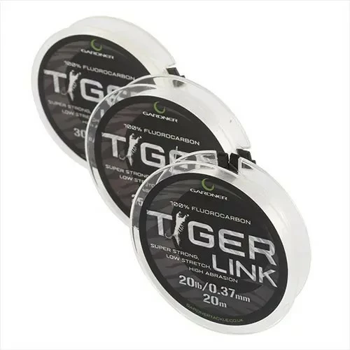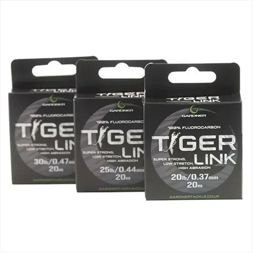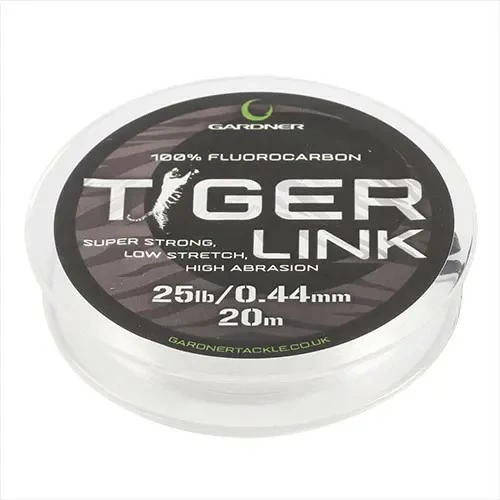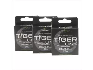 Jedná se o polymer, který poskytuje výjimečnou odolnost proti oděru a pevnost v uzlu. Tiger Link je odolný vůči UV záření, má dlouhou životnost a dobrý poměr cena/výkon. Specifikace: - Tiger Link lze dokonale narovnat pevným tahem - rychle potápivý - zlepšuje prezentaci návnady - vynikající pevnost uzlů se širokou škálou možností uzlů - perfektní pro tvoření návazců jako jsou Ronnie Rigs, Hinged Stiff Rigs a pro vázání D Rigs - k dispozici v 20lb, 25lb a 30lb - návin 20m v cívkách - vynikající odolnost proti oděru - průměr: 20 lb/0,37 mm, 25 lb/0,44 mm, 30 lb/0,47 mm