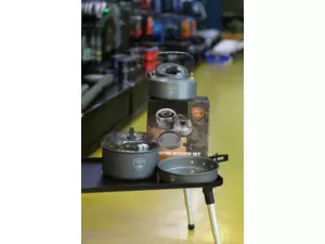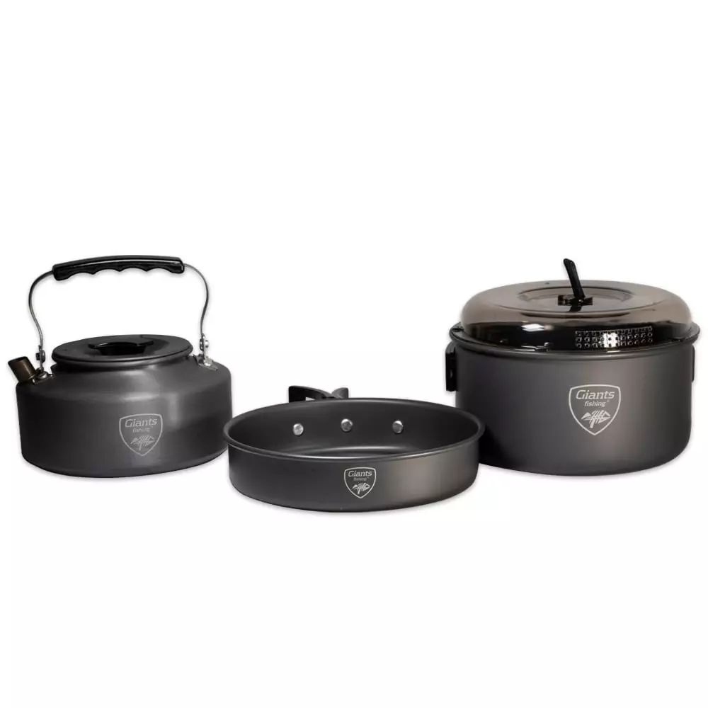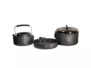 Campingová kuchyňská sada, která obsahuje konvičku, pánev a hrnec s pokličkou. Vše je vyrobeno z lehkého, eloxovaného hliníku a pro snadný transport vše pasuje do sebe.