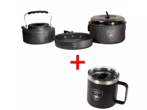 Akční set, který obsahuje campingovou sadu: pánev, hrnec s pokličkou, konvičku a nerezový thermo hrnek s obsahem 400ml. Další info