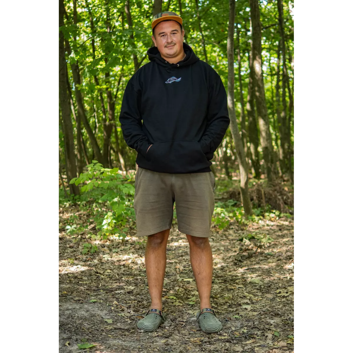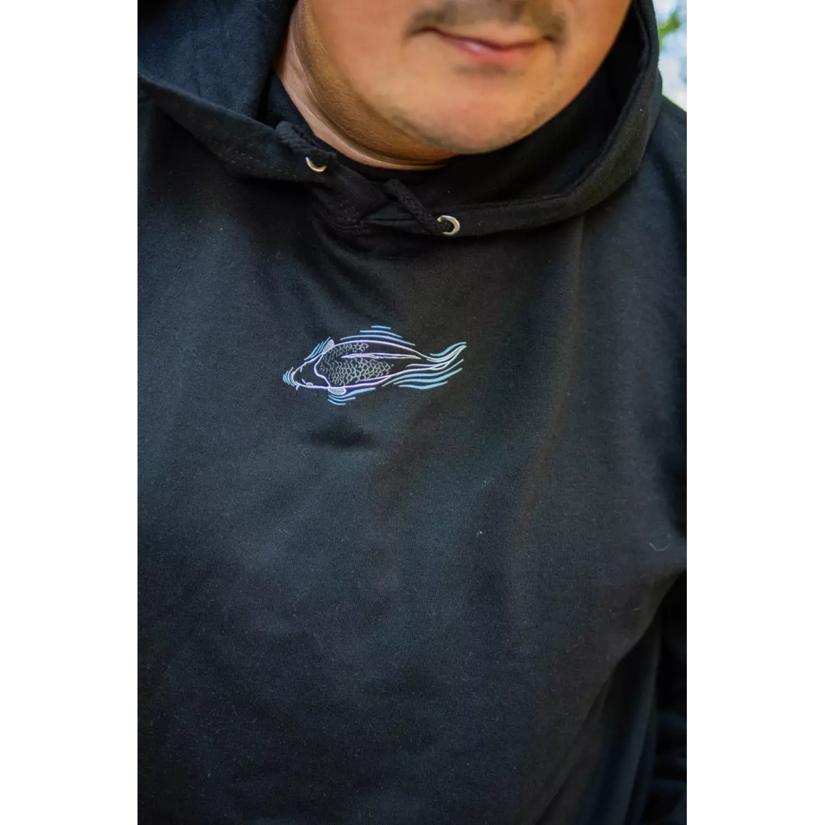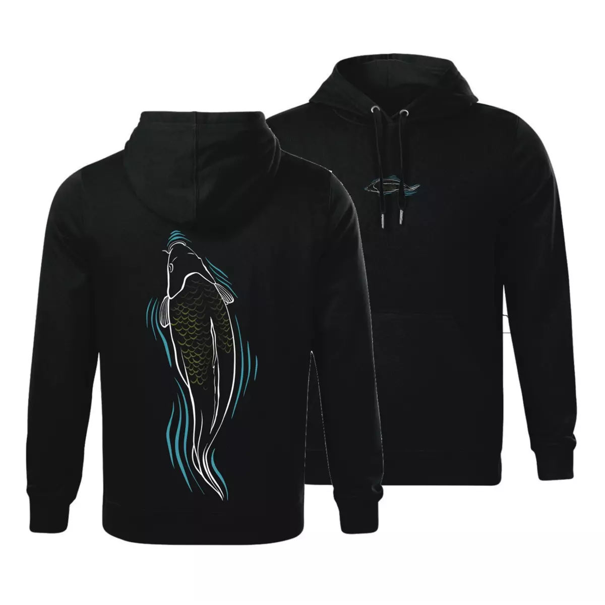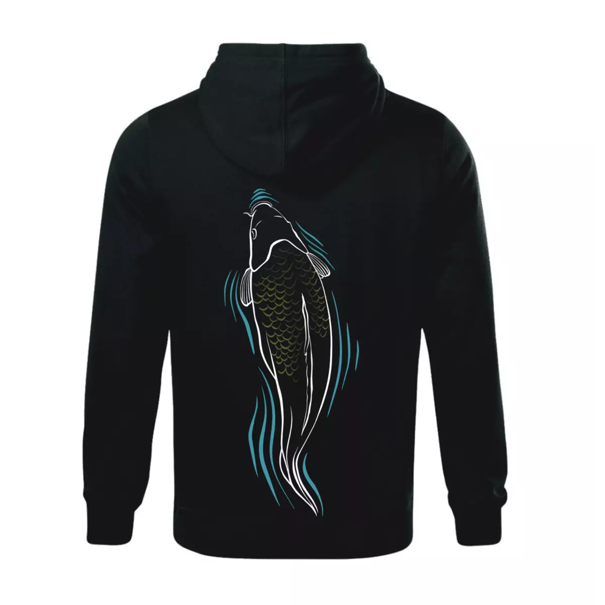 Mikina černé barvy s našim originálním návrhem plavajícího kapra u hladiny. Decentní návrh kapra na prsou a větší motiv na zádech.