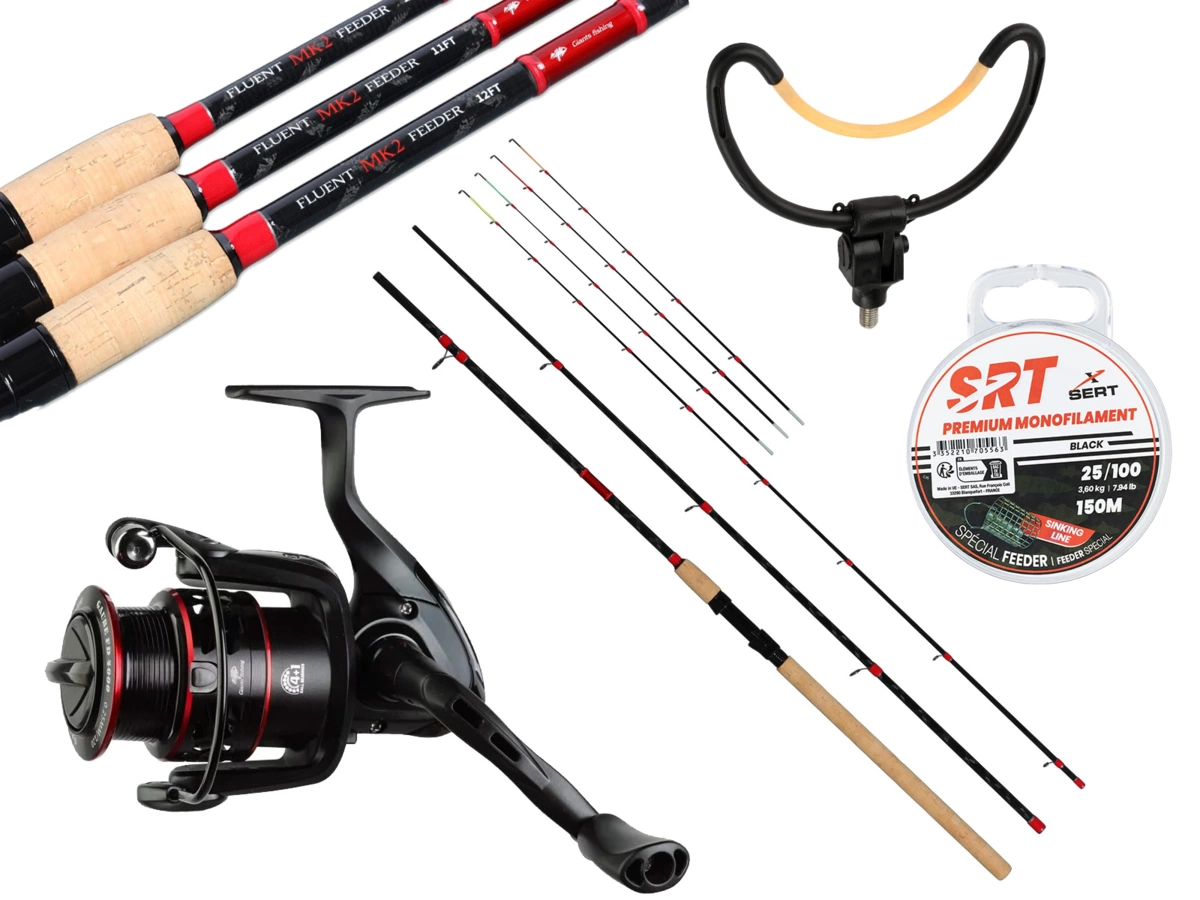 Akční set obsahuje luxusní feederový prut, který je dodáván se čtyřmi špičkami, navijákem s přední brzdou, 4+1 ložisky a kovovou cívkou.