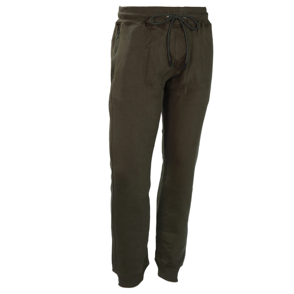 Tepláky moderního střihu v khaki zelené barvě, které mají dvě přední a jednu zadní kapsu.