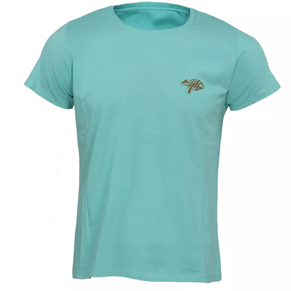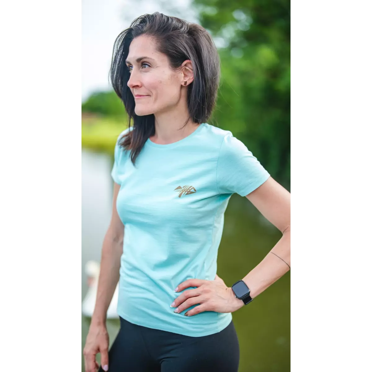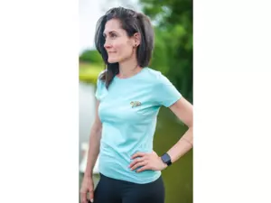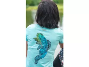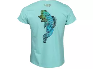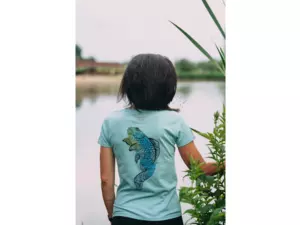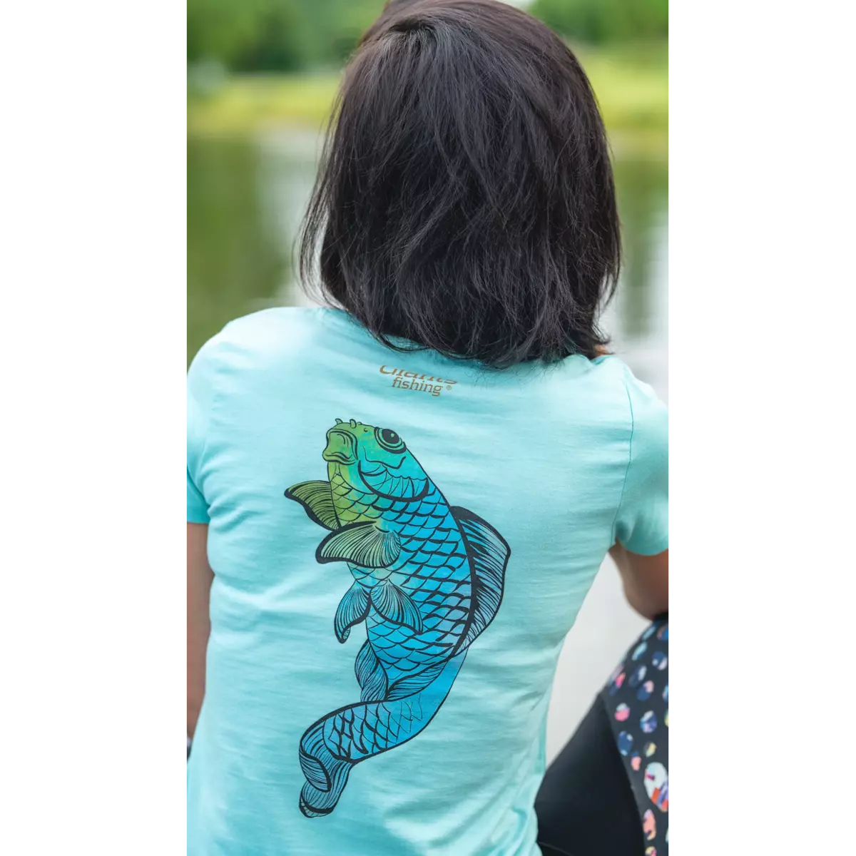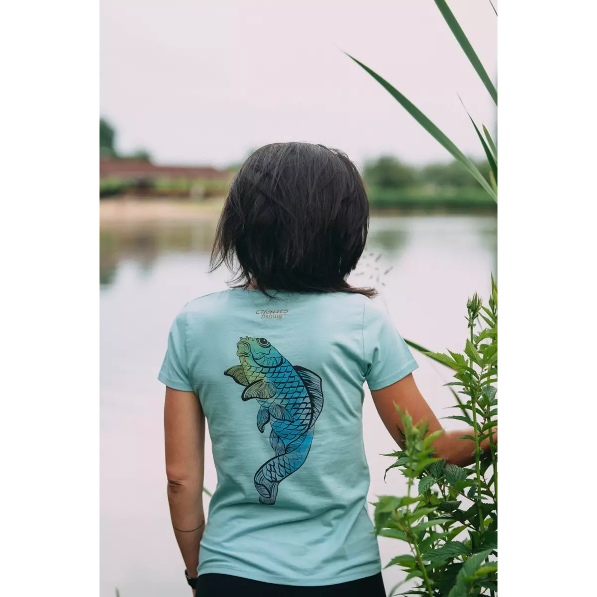 Kvalitní dámské tričko v zelené pastelové barvě s designem koi kapra na zádech. Další info