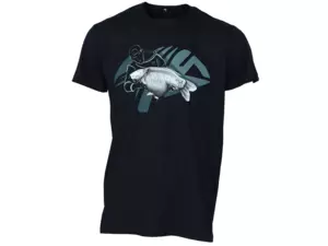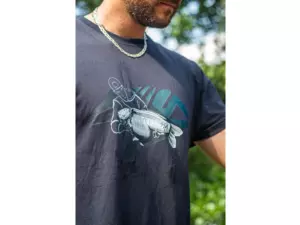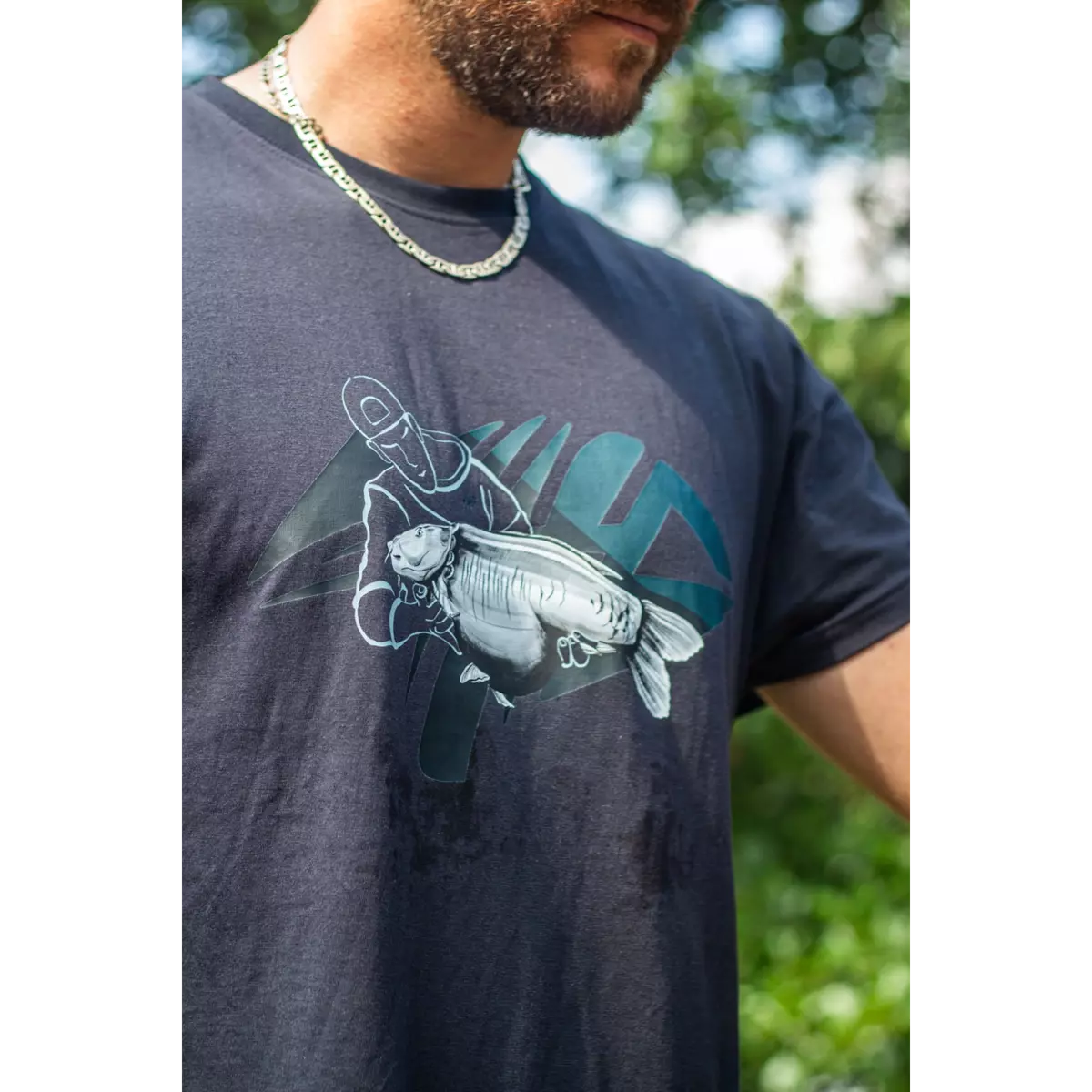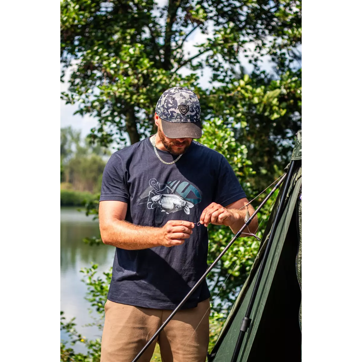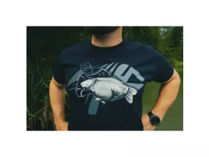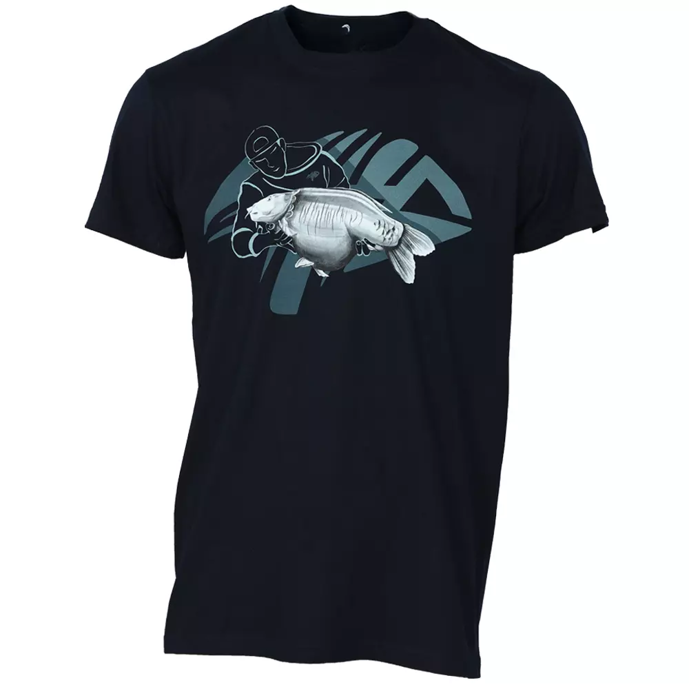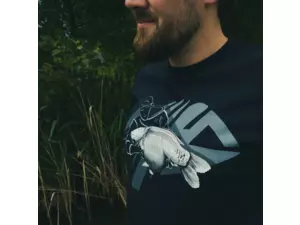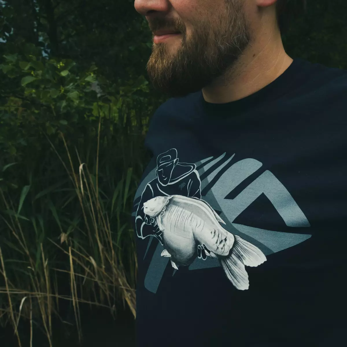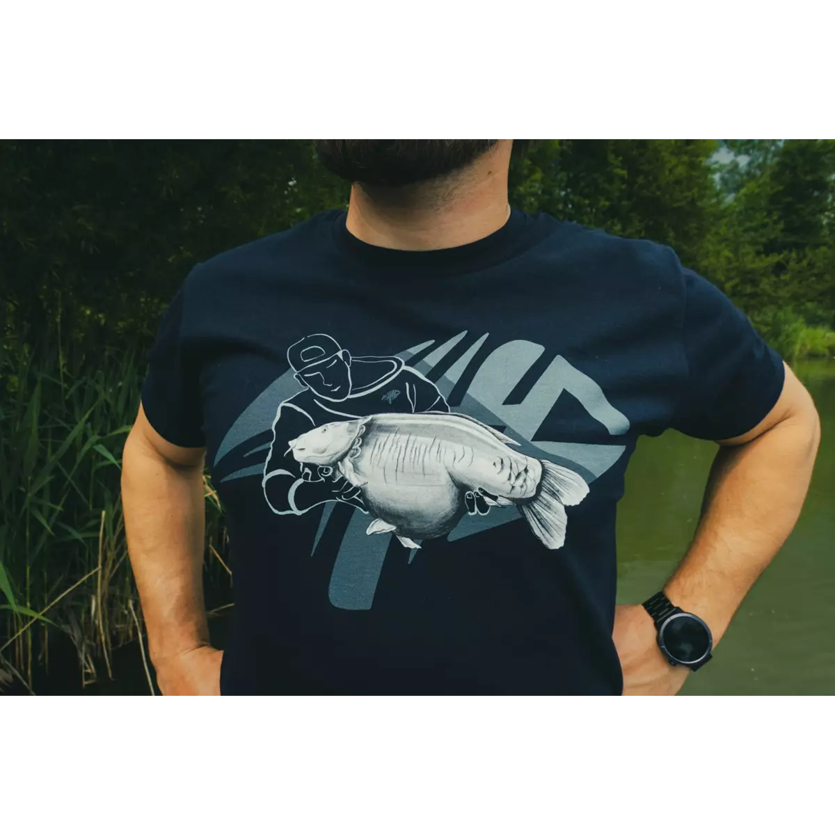 Kvalitní tričko v tmavě modré barvě s designem rybář s úlovkem kapra. Další info