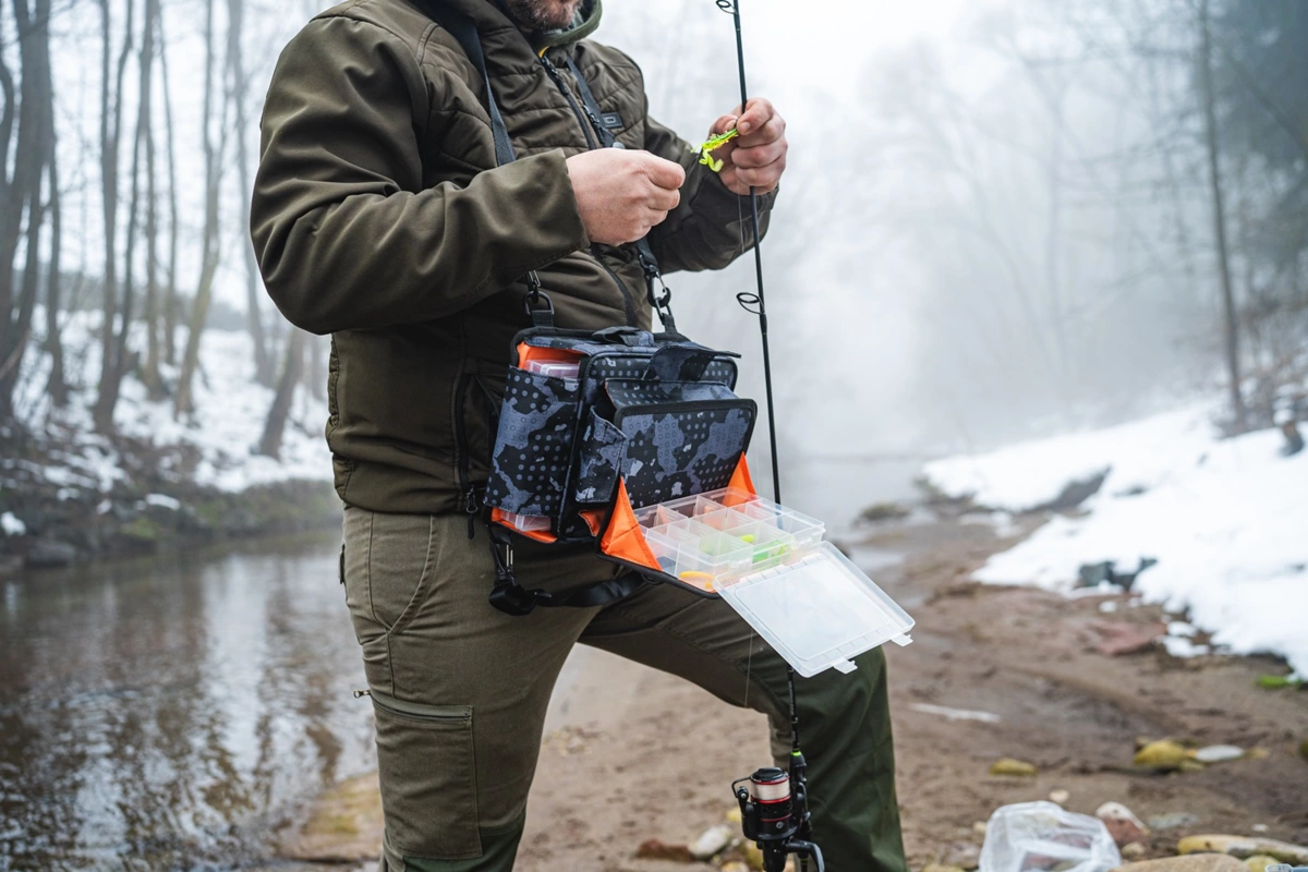 Vláčecí taška, kterou můžete použít jako ledvinku s výklopnou platformou na které si můžete pohodlně vybírat nástrahy.