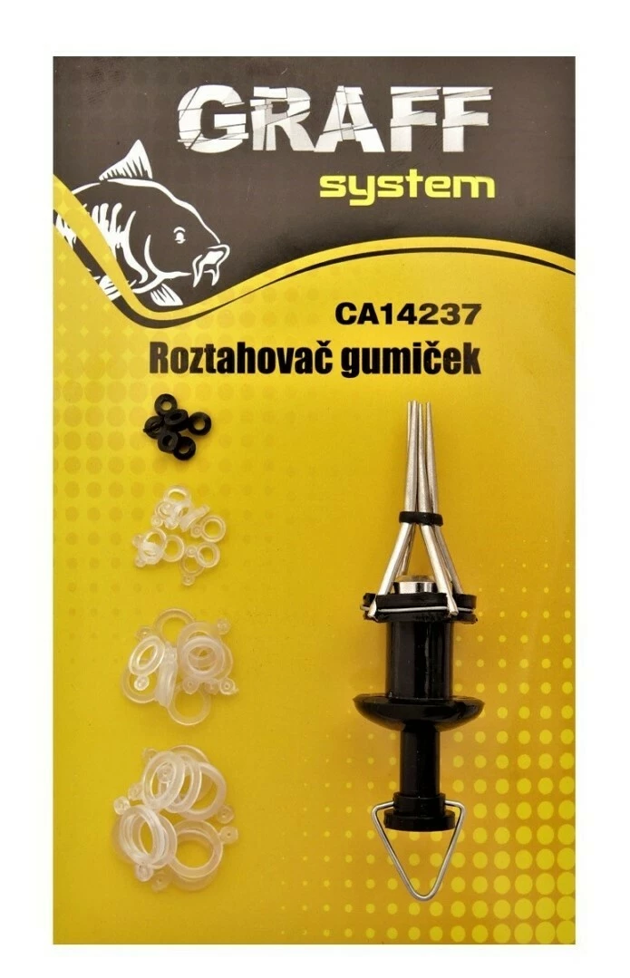Roztahovač kroužků nebo navlékač na pelety. Praktická pomůcka k navlékání silikonových kroužků zejména na pelety. Stlačením kleští v jedné ruce se ramínka společně s navlečeným kroužkem roztáhnou a je možné snadno do kroužku vložit peletu.
