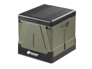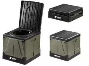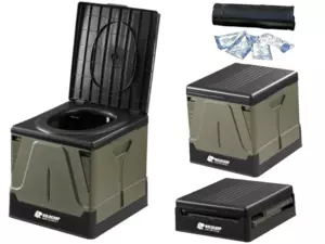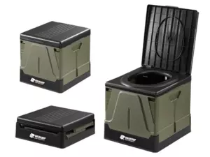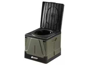 Kempingový přenosný skládací záchod v tmavě zeleném barevném provedení v sadě se stanem a garbagem setem. Další info