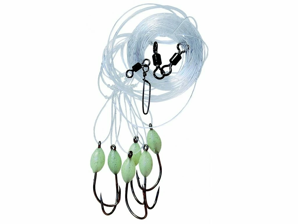 Návazec obsahuje velké fosforeskující korále, pevné obratlíky a karabinu k rychlé výměně spodního závaží.