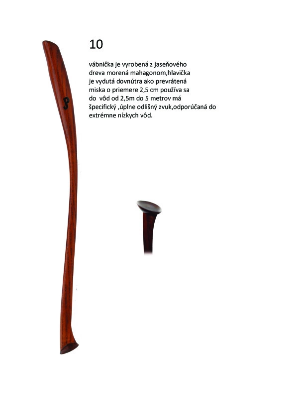 Vábnička je vyrobená z jasanového dřeva namořená mahagonem, hlavička je vyoblená do vnitř jako převrácená miska o průměru 2,5cmcm použíá se do vod od 2,5 do 5m a má specifický zvuk., doporučuje se do mělkých vod. Další info