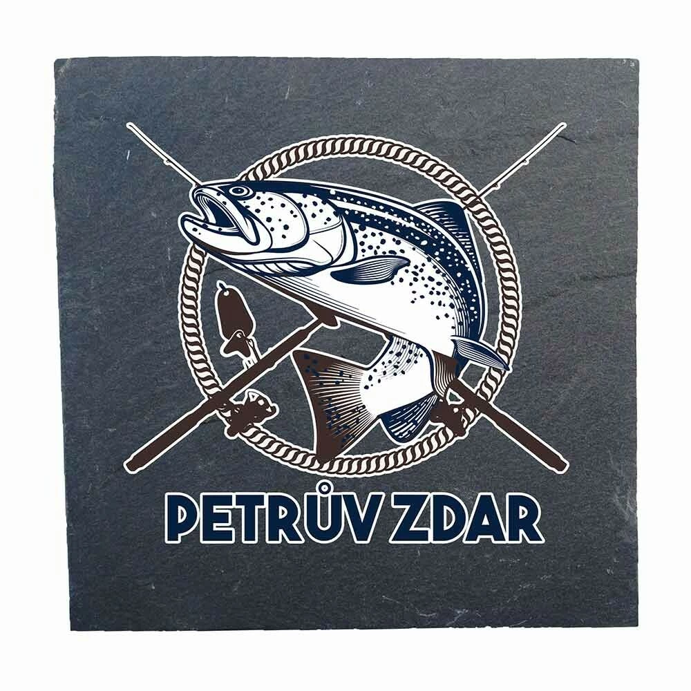Kameninový hranatý podtácek pod hrnek, skleničku nebo půllitr s pivem pro rybáře s potiskem - Petrův zdar. Skvělý drobný dárek pro rybáře.