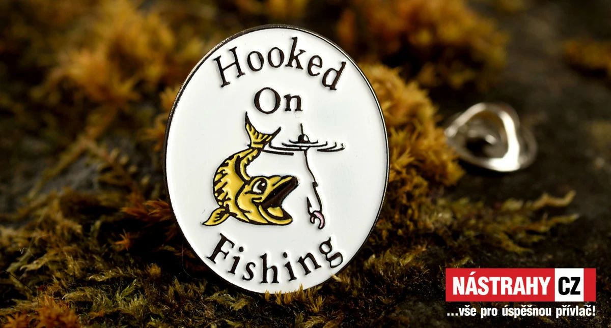 Kovové smaltované rybářské odznaky Hooked on Fishing (25mm)