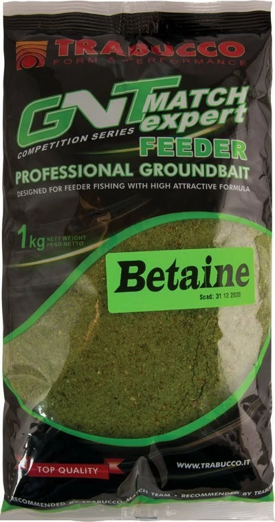 GNT Feeder Expert Betain je vyroben ze středně jemné struktury tmavě zelené barvy s velmi silnou vůní rybí moučky a práškového betainu, což je látka vysoce rozpustná ve vodě bohatá na atraktory a je mimořádně chuťově stimulující převážně pro kaprovité ryby. Jde o krmení speciálně navržené pro feederový lov se zaměřením na cílové ryby kapr, cejn, karas a lín. Krmení je dobře kombinovatelné s ostatními typy směsí řady GNT Feeder Expert. K zefektivnění finální směsi je dobré použít příslušný partikl či živou složku.