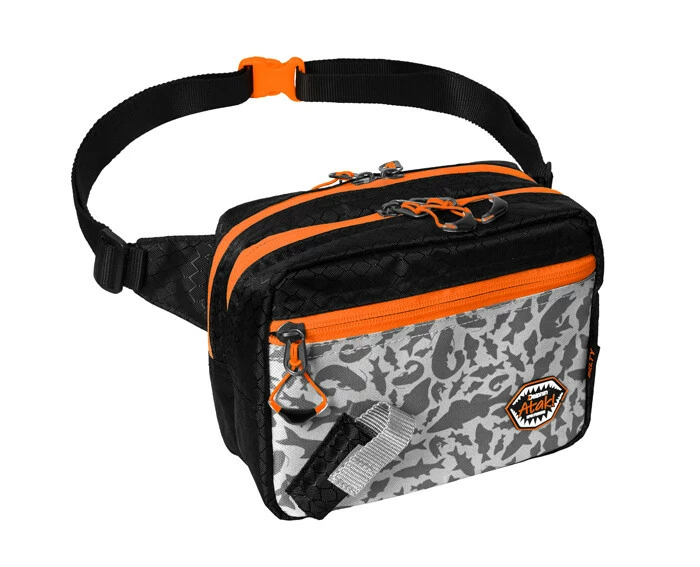 Kvalitní vnější zipy oranžové barvy jsou vybaveny plastovými taháčky na oranžovém popruhu, který je na konci rozšířený, a proto je možné ho rychle uchopit. Doplňky oranžové barvy umožňují rybáři, aby byla taška dobře viditelná i za šera a věděl ji okamžitě najít. Taška je ušita z lehké, ale přitom odolné látky černé barvy. Design tašky doplňuje naše jedinečná šedá ATAK! kamufláž se siluetami dravých ryb.