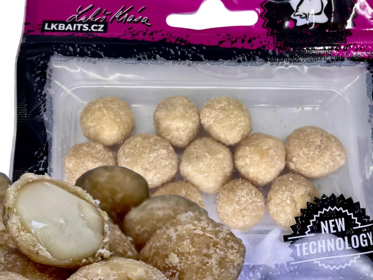 Toto je magický ořech! Pokud hledáte alternativu nebo přírodní nástrahu, kterou můžete místní ryby překvapit, pak je tu náš speciální kouzelný makadamový ořech. Nástraha která je pražená pro zvýraznění svého přirozeného aromatu a nakládaná do mandlového oleje. Následně je ořech obalen arašídovou drtí, která se do vody uvolňuje jako první. co je super, že ořech je nadlehčený až mírně plovoucí. Ideální v kombinaci s nástrahou: LK Baits Nutrigo Balanc Particle Tiger Nuts.