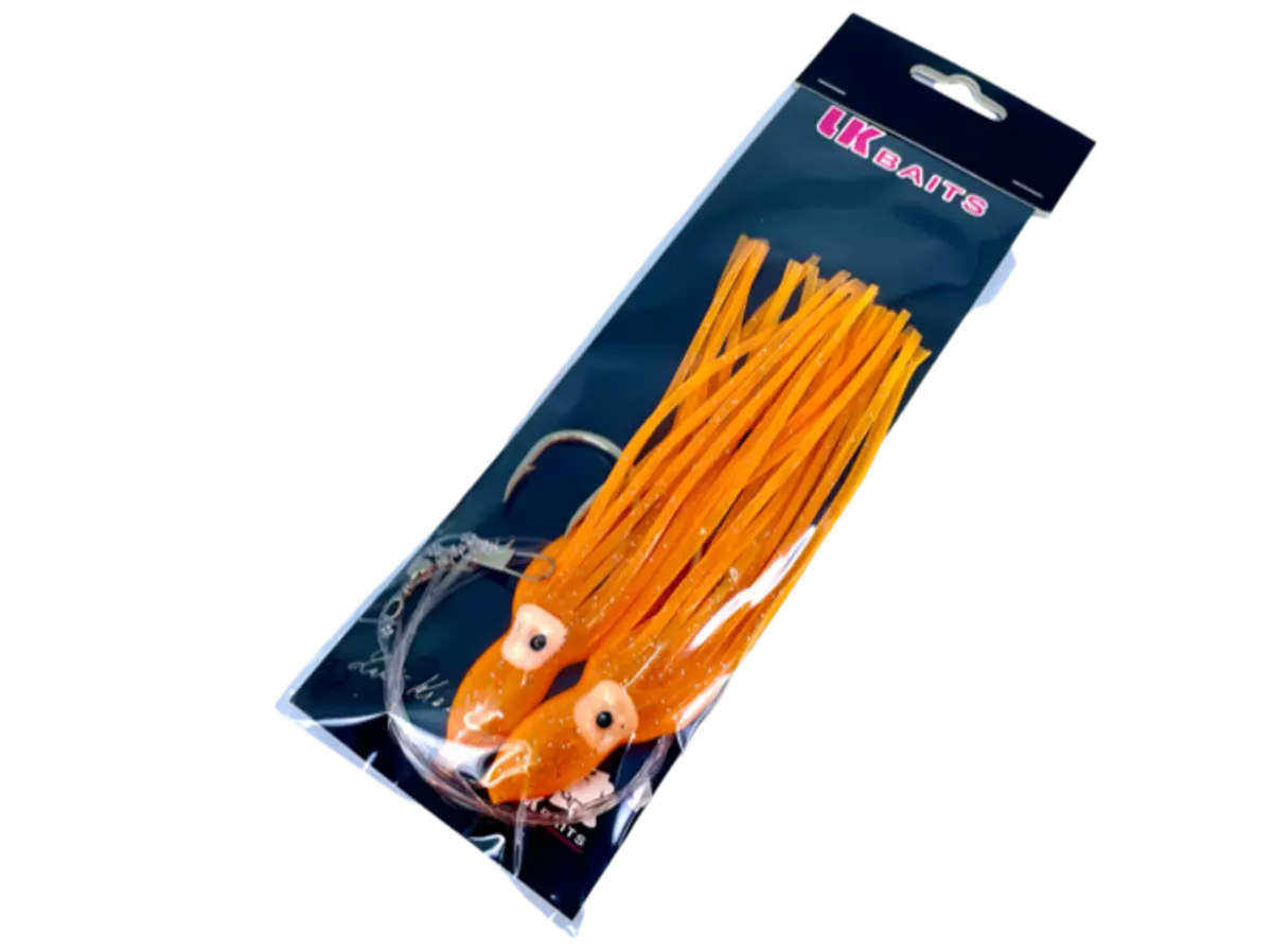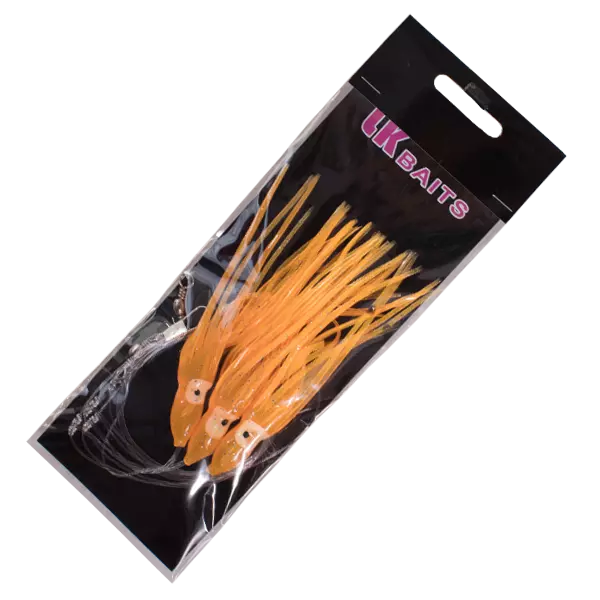 Tři nástrahy na jednom návazci imitující chobotnice je ideální pro mořský rybolov. Především pro lov mníků, tresek, makrel a jiných druhů ryb. Oranžová barva/tři háčky.