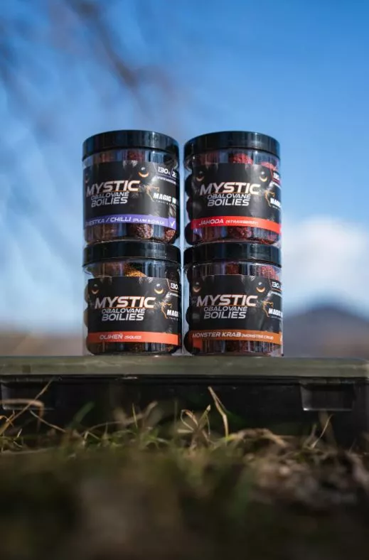 Toto chytací boilies není jen obalené v práškovém dipu. Náš chytací Mystic je přímo oplášťovaný super atraktivní vrstvou, která ve vodě okamžitě vytváří oblak barvy a vůně…. Uvolněné kousky pláště vzlínají a plavou k hladině a lákají i ryby ze sloupce. Barva a esence zatraktivňují lovné místo. Po rozpuštění pláště začíná fungovat střed, a to je naše chytací boilies. Toto prostě musíte vyzkoušet….