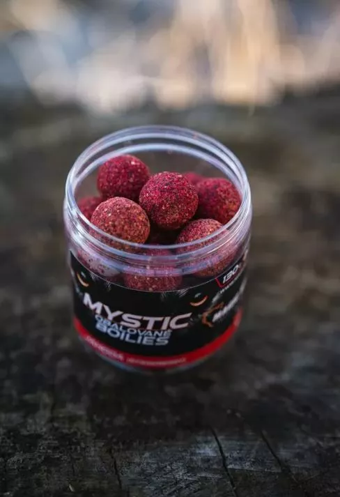 Toto chytací boilies není jen obalené v práškovém dipu. Náš chytací Mystic je přímo oplášťovaný super atraktivní vrstvou, která ve vodě okamžitě vytváří oblak barvy a vůně…. Uvolněné kousky pláště vzlínají a plavou k hladině a lákají i ryby ze sloupce. Barva a esence zatraktivňují lovné místo. Po rozpuštění pláště začíná fungovat střed, a to je naše chytací boilies. Toto prostě musíte vyzkoušet….