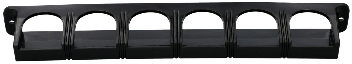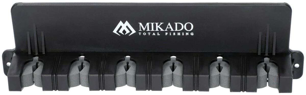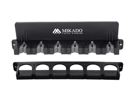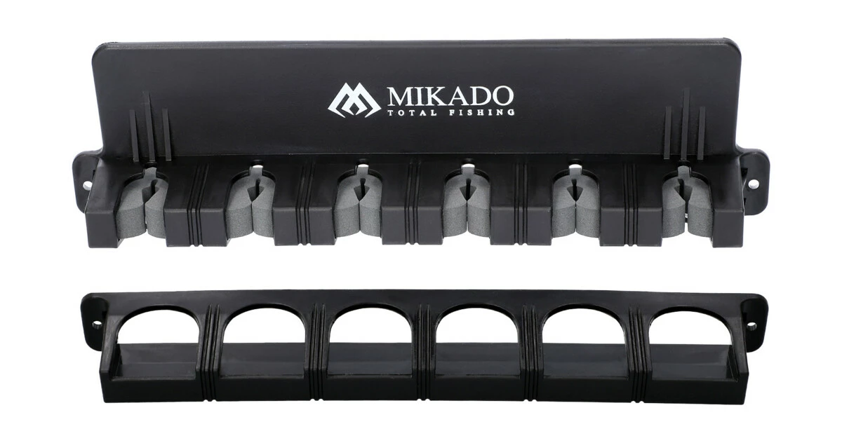 Dvoudílný držák pro bezpečné a přehledné uskladnění rybářských prutů určený k montáži na zeď. Provedení na 6 prutů.