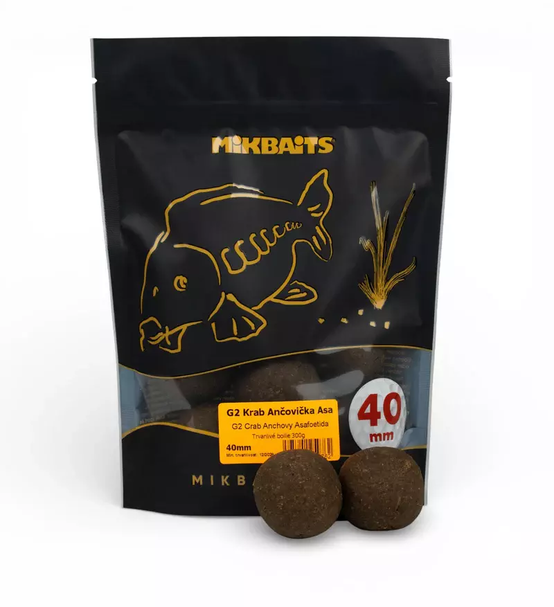 40 mm golf size boilie jsou extra velkou selektivní nástrahou, která na jedné straně limituje záběry od nechtěných ryb, a naopak je lákavá pro velké trofejní kusy kaprů. Gangster G2 Krab&Ančovička&Asa je bezpochyby největší ikonou mezi boilie na velké kapry. Obrovskou popularitu si drží od uvedení na trh v roce 2010 a každým rokem ji ještě navyšuje. Pro mnoho zkušených kaprařů je to jednoznačná volba, pokud je čekají výpravy na velké ryby, prestižní závody nebo chtějí na neznámou či velmi obtížnou vodu něco, na co se můžou spolehnout. G2 má v sobě ale jakýsi zvláštní dar, a tak si ji oblíbili i rybáři, kteří jezdí na víkend či jen odpoledne na privátní vody. Úspěšně s ní chytají i rybáři na menších řekách či rybnících. Kouzlo G2 spočívá v neskutečně našlapané směsi bez jakýchkoli objemových přísad, prvotřídních esencích, esenciálních olejích a v neposlední řadě Ančovičkovému extraktu, který používáme právě a jen do tohoto boilie. I díky tomu má Gangster silnou slanou chuť a vůni mořské potravy. Je velmi pevný, na háčku vydrží nastražený až dva dny, samozřejmě, při vysoké aktivitě sumečků nebo bílé ryby se může rozpadnout výrazně dřív. Funguje i s minimem návnady, ryby na něj reagují okamžitě, ale čím déle a více s ním vnadíte, tím je lepší.