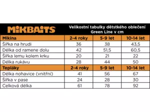 Kolekce dětského oblečení Mikbaits Green line zahrnuje vedle mikin i tepláky. Jsou z velmi příjemného pohodlného materiálu, mají elastické zakončení pasu i nohavic, dvě kapsy po stranách a vzadu menší kapsu s logem. Velikosti jsou na 2 až 4 roky, 5 až 9 let a 10 až 14 let.