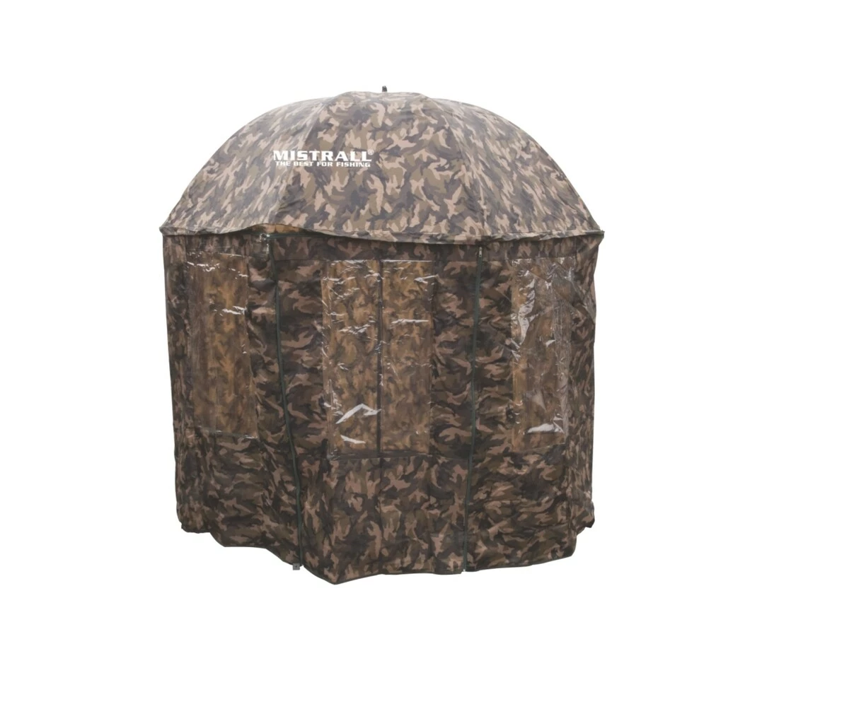 Rybářský deštník z materiálu 210D, vodní sloupec 3000 mm. Vybaven nastavitelným vrchlíkem, díky kterému lze změnit úhel sklonu až o 45 stupňů. Deštník má zástěnu, ve které se nacházejí 3 okna. Maskáčový vzor je u vody nenápadnější a dodává pocit lepšího splynutí s přírodou.