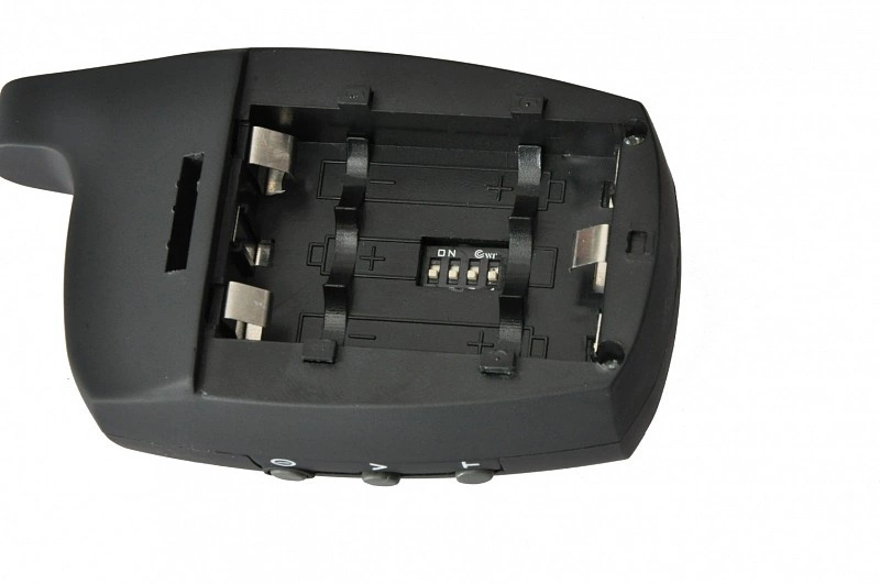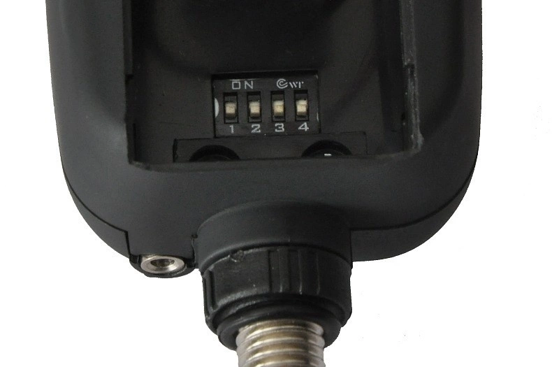 Sada hlásičů M1300 je při prodeji nastavena na základní frekvenci bezdrátové komunikace. (Všechny přepínače - piny, které se nacházejí pod bateriemi, jsou orientovány směrem dolů - viz. fotografie). Pro eliminaci možného rušení s jinými sadami hlásičů M1300 doporučujeme změnit nastavení frekvence. Změna se provádí přepnutím jednoho nebo více přepínačů do druhé polohy. Je možné nastavit až 16 různých kombinací. Na všech hlásičích a příposlechu v sadě je samozřejmě nutné nastavit stejnou kombinaci přepínačů.