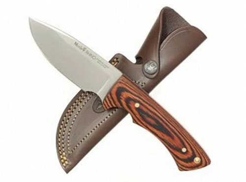 Pevný lovecký nůž Muela Rhino 10 R s dřevěnými střenkami a pěkným koženým pouzdrem.