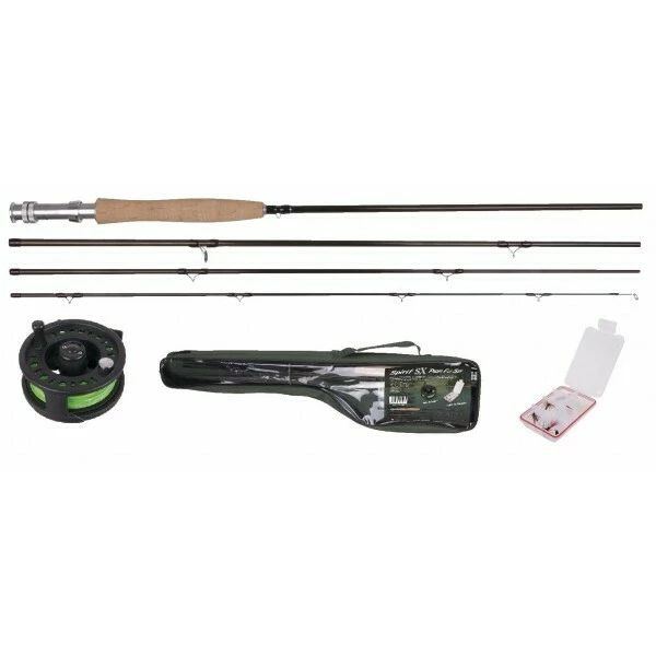 Muškařský set. Obsahuje muškařský prut AFTMA 5-6, naviják se šňůrou fluorozelené barvy a praktickou krabičkou s několika muškami.