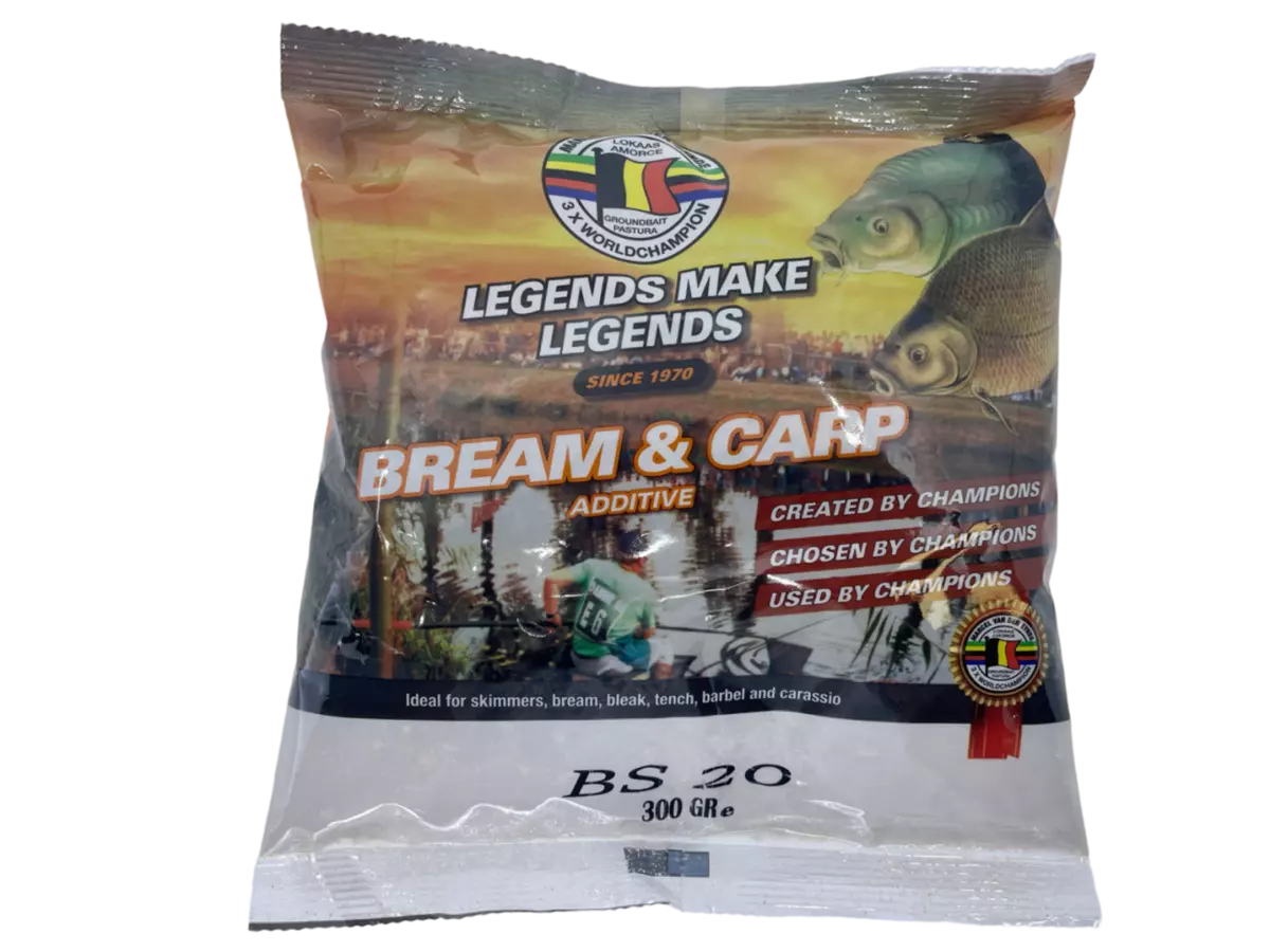 V sídle společnosti Marcel Van Den Eynde jsme vyvinuli speciální stimulátor chuti k jídlu (aditivum), BS20. Během testování se tento produkt ukázal jako všestranné aditivum vhodné pro jakýkoli typ rybolovu (feeder, Method feeder a plavaná). BS20 je chuťový stimulátor, který nám lidem nedává téměř žádnou chuť. Produkt je skutečně vyvinut na úrovni detekce ryb. BS20 funguje velmi dobře s některými našimi aditivy v poměru 1-1: Bream T, Vanilla, Strawberry, Banana (1 díl BS20 = 1 díl uvedených aditiv), pokud chcete použít Bream Caramel a Big Fish použijte poměr 1:2. BS20 lze používat po celý rok, ale nejlepších výsledků bylo dosaženo v teplejších obdobích. Také jsme zaznamenali, že BS20 má dobré spojení se spíše sladkými produkty, jako je např. Record Sweet, ve srovnání se slanými produkty, jako je např. Record Silver. Výsledky našich testů také ukázaly, že BS20 fungoval výrazně lépe na pomalu tekoucích a stojatých (jezerních) vodách. Rozhodli jsme se pro obsah 300 gramů, protože toto množství perfektně využijete na mix 2 až 4 kg. BS20 může nejlépe přidat 50 % na začátku a 50 % na konci nebo na samém konci při přípravě (míchání) krmiva. Podle výsledků testů jsme zaznamenali, že s přidáním BS20 bylo chyceno více větších exemplářů. Produkt můžete také perfektně použít na své červy! Jsme přesvědčeni, že tento produkt je skutečnou přidanou hodnotou k vaší návnadové směsi. Nejlepších výsledků bylo dosaženo v tomto mixu: 1 kg Record Sweet + 1 kg Skimmer + 250g Big Fish a 100 gramů BS20.