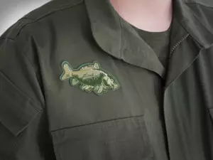 Imageová nášivka zlato-zelené barvy ve tvaru kapra, kterou si můžete vylepšit jakýkoli kus svého oblečení, případně tašku nebo jinou textilii. S tímto doplňkem budete vyčnívat z řady a odlišíte se od ostatních.