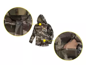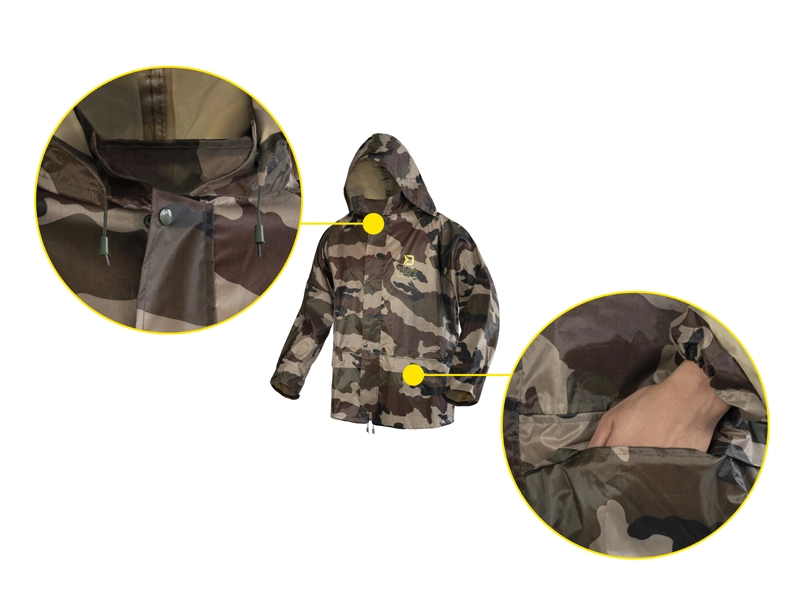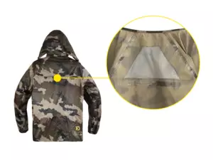 Zapínání bundy je zajištěno pomocí odolného zeleného zipu překrytého lemem tkaniny se zapínáním na 4 plastové cvoky, což zvyšuje ochranu před deštěm. Kapuce je vybavena zatahováním na šňůrku, takže je možné přizpůsobit si ji podle svých potřeb a navíc si ji můžete srolovat a zazipovat do límcového prostoru. Límec je vyvýšen pro lepší překrytí krku a šíje a opatřený dalšími dvěma cvoky na připnutí kapuce.