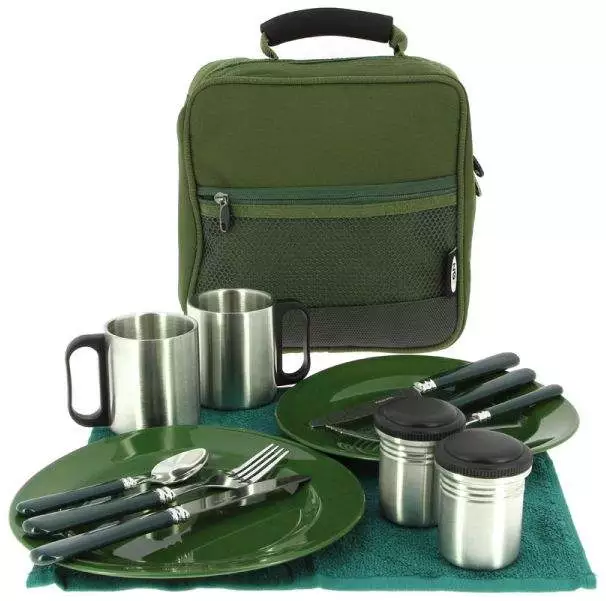 Set kvalitního jídelního příslušenství pro rybaření a kemping. Obsahuje utěrku, talíře z velmi odolného plastu, kompletní příbory, nerezové termohrnky a nerezové dózy na cukr a sůl. Vše je zabaleno v kvalitním polstrovaném pouzdru se zipem a transportním uchem.
