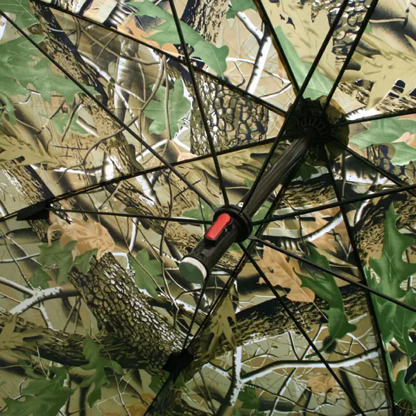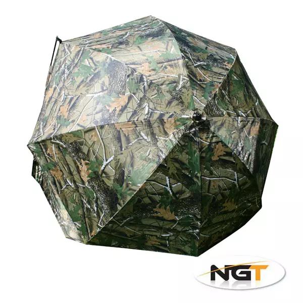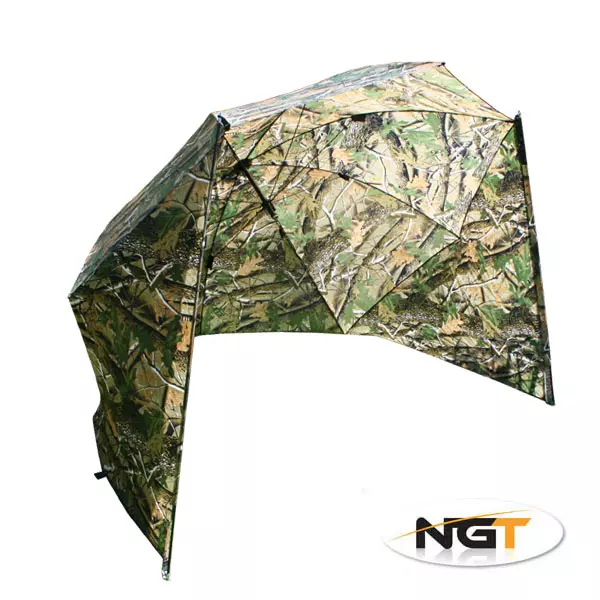 Kamuflážní, deštníkový přístřešek s bočnicemi zkonstruovaný z pevné konstrukce.
