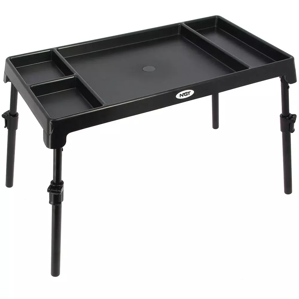 NGT Stolek XPR Bivvy Table je nový, velice prakticky dělěný, plastový stolek do bivaku primárně určený pro přípravu montáží a návazců. Dělený znamená, že jeho pracovní plocha je rozdělena na 4 různě velké části pro vyskládání všemožné bižuterie a potřeb pro navazování. Díky vysoké hraně kolem celého obvodu stolku nehrozí, že se Vám bižuterie a drobnosti rozkutálí a poztrácí se. Samozřejmostí jsou nastavitelné teleskopické nohy s výškou od 29 do 40cm.