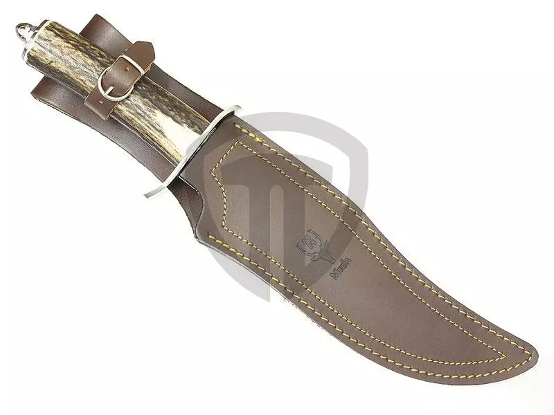 Velký lovecký nůž Muela Lobo 23A s rukojetí z parohu a koženým pouzdrem.