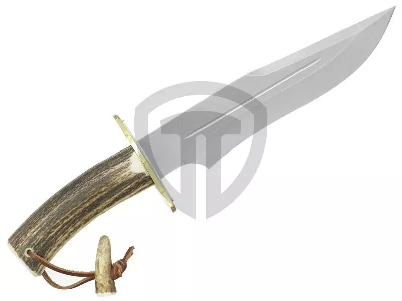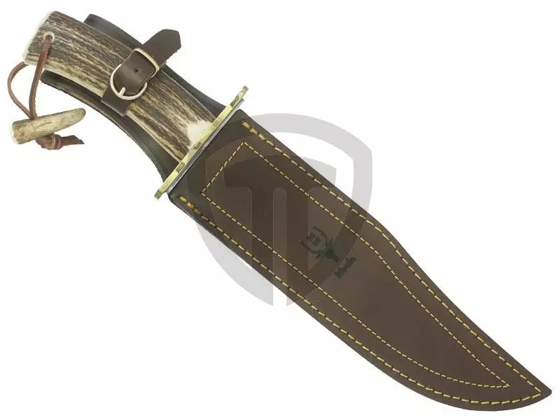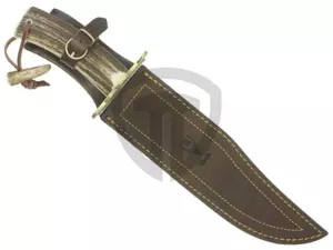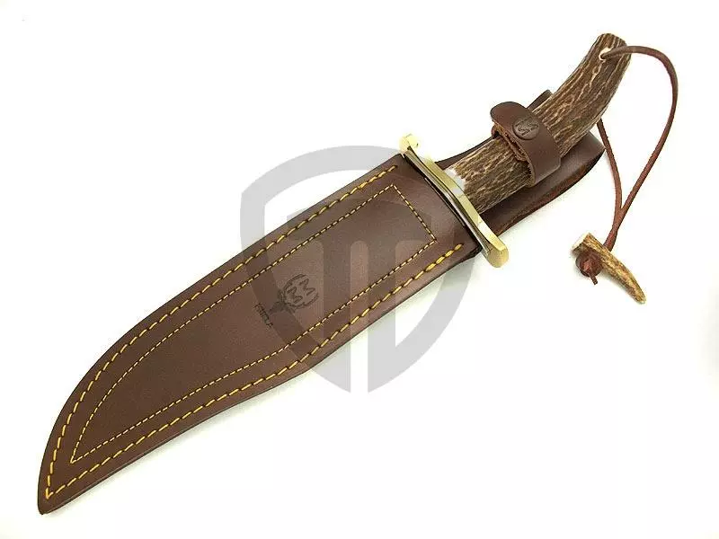 Velký lovecký nůž Muela Magnum 23A, rukojeť z parohu, oboustranná záštita, kožené pouzdro. Další info