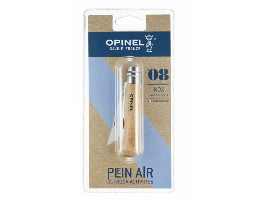 Tradiční zavírací nůž Opinel s rukojetí z bukového dřeva a čepelí z nerezové oceli Sandvik, balení v blistru.